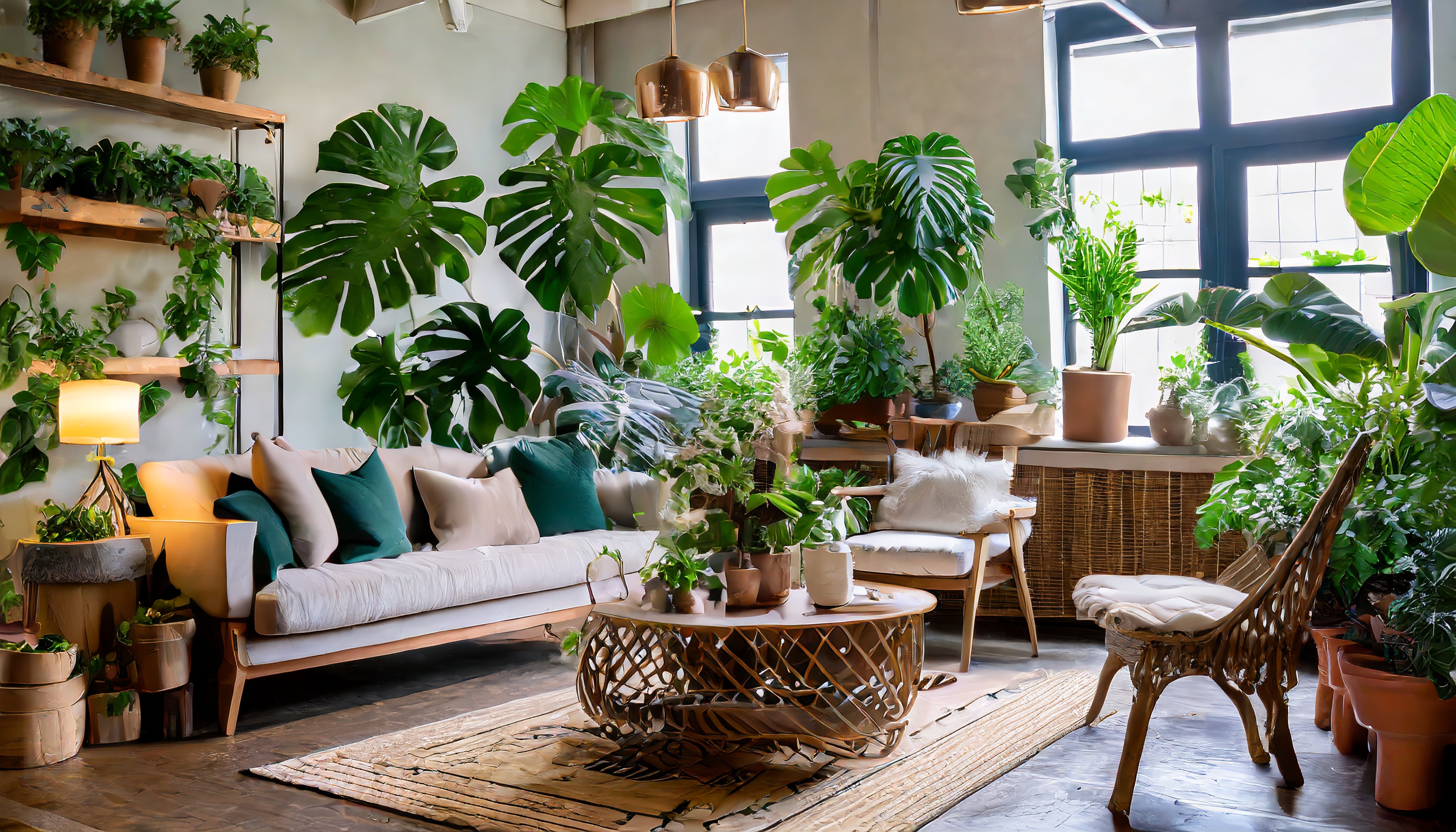 • Macetas colgantes o estantes verdes como elementos de diseño.